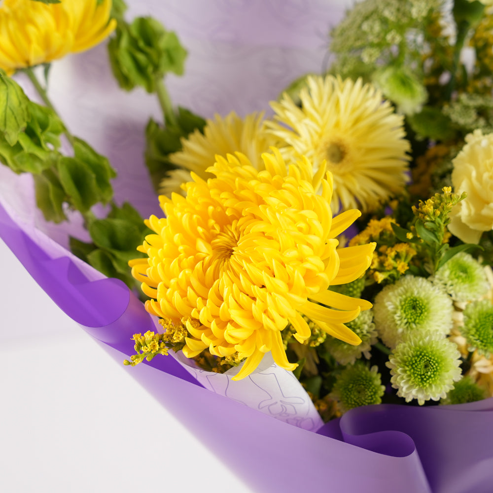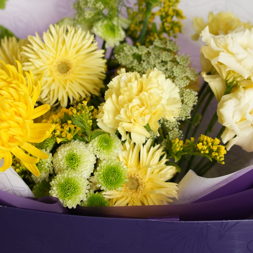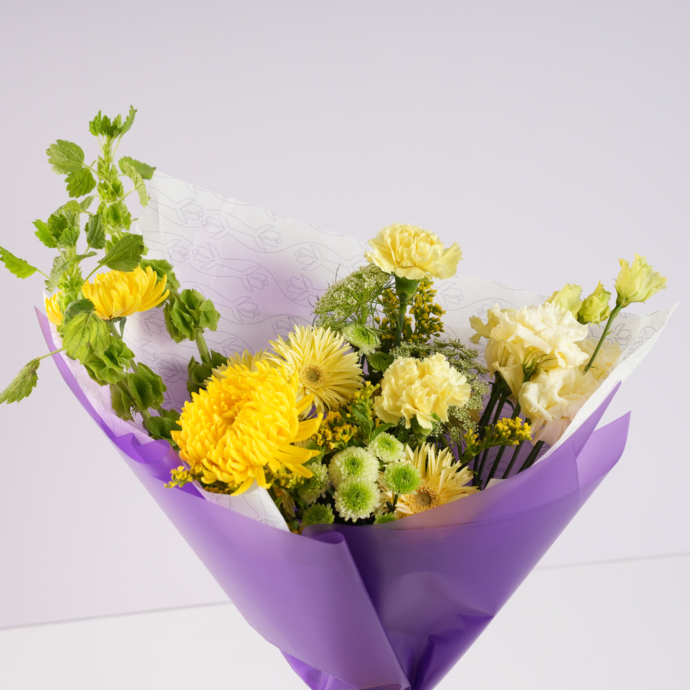 A bouquet in warm yellow tones, arranged with balance and soft greenery for a bright, elegant finish.