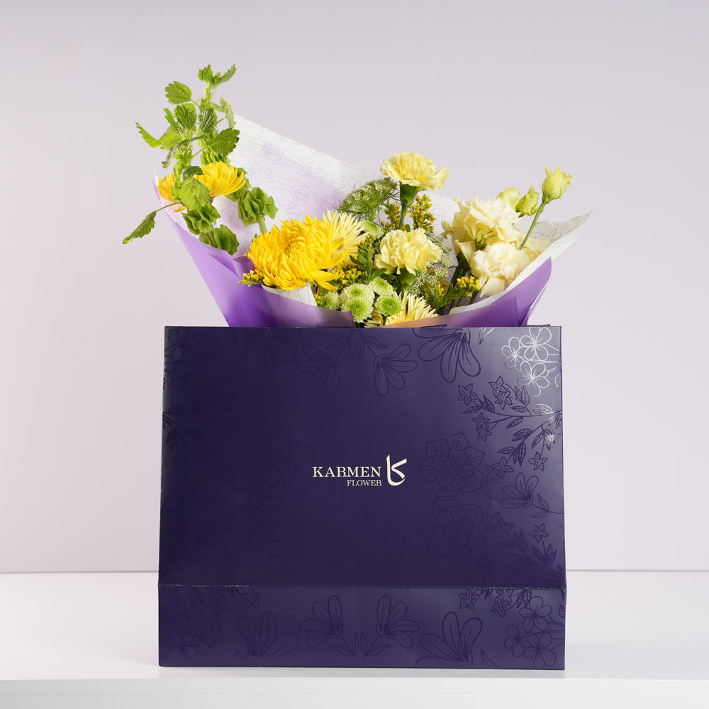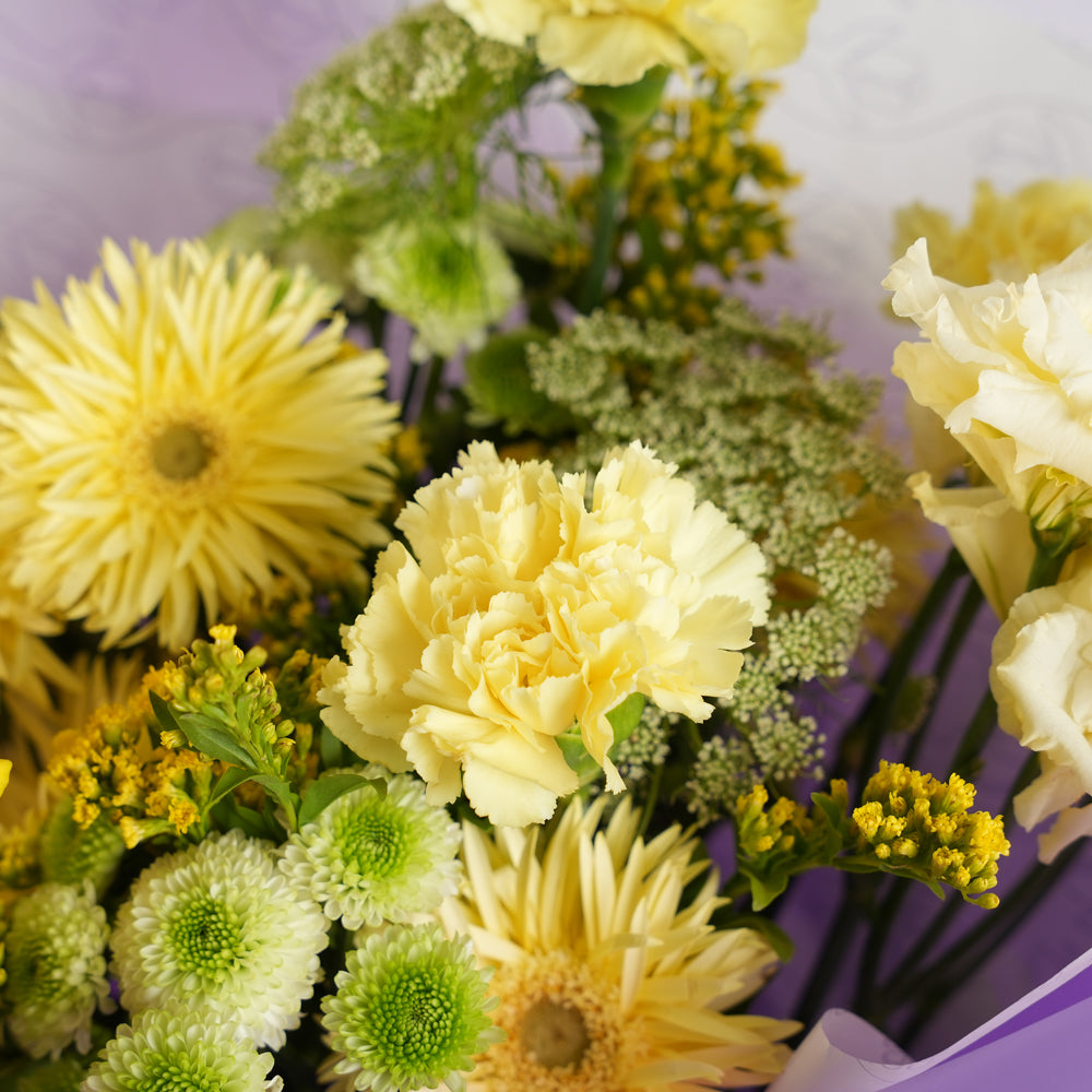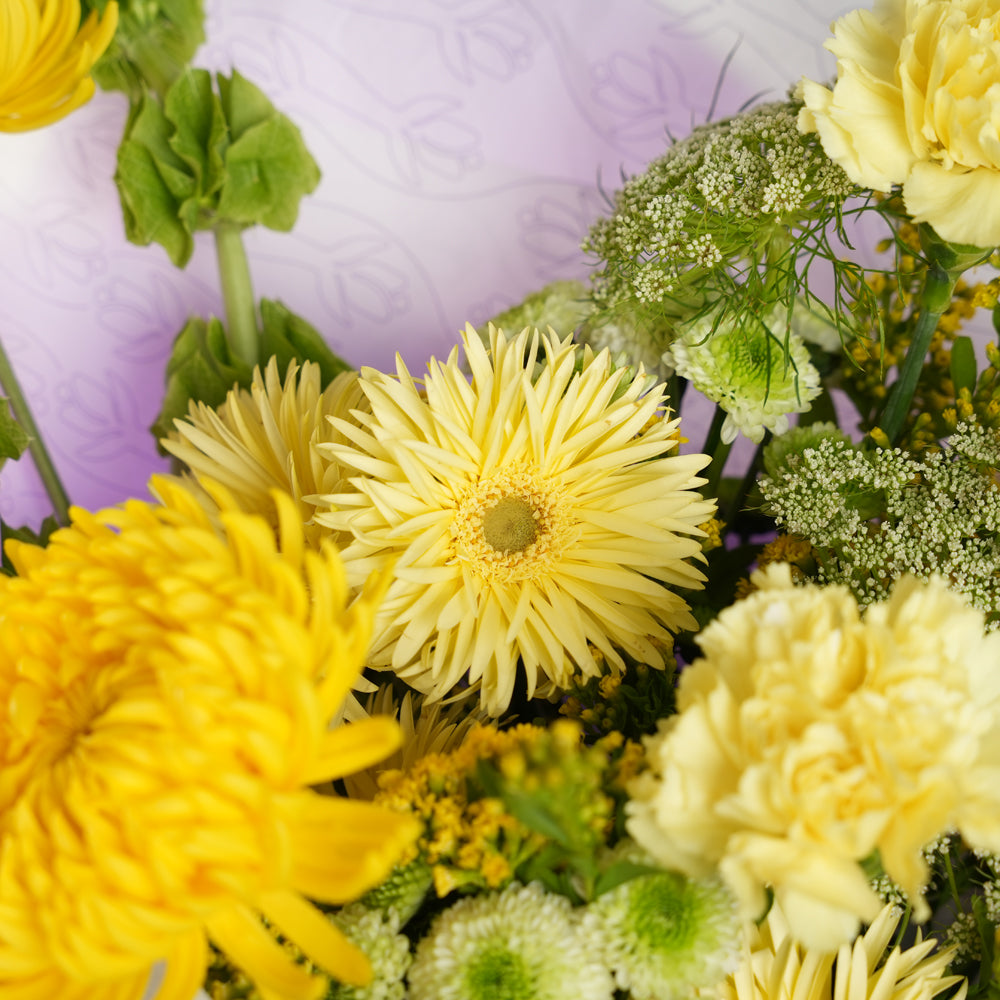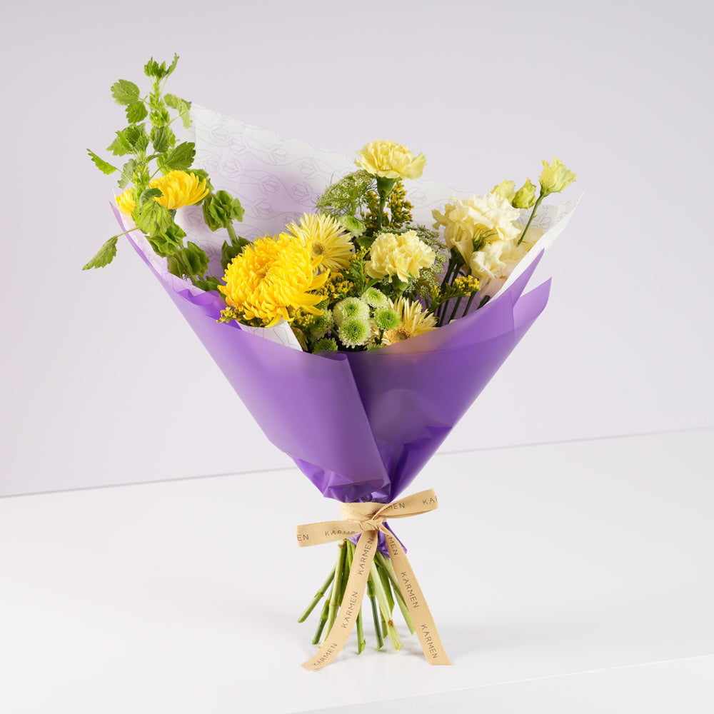 A bouquet in warm yellow tones, arranged with balance and soft greenery for a bright, elegant finish.