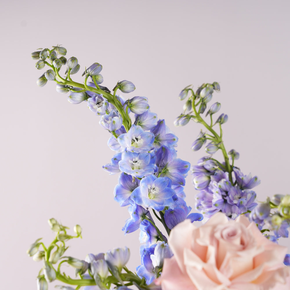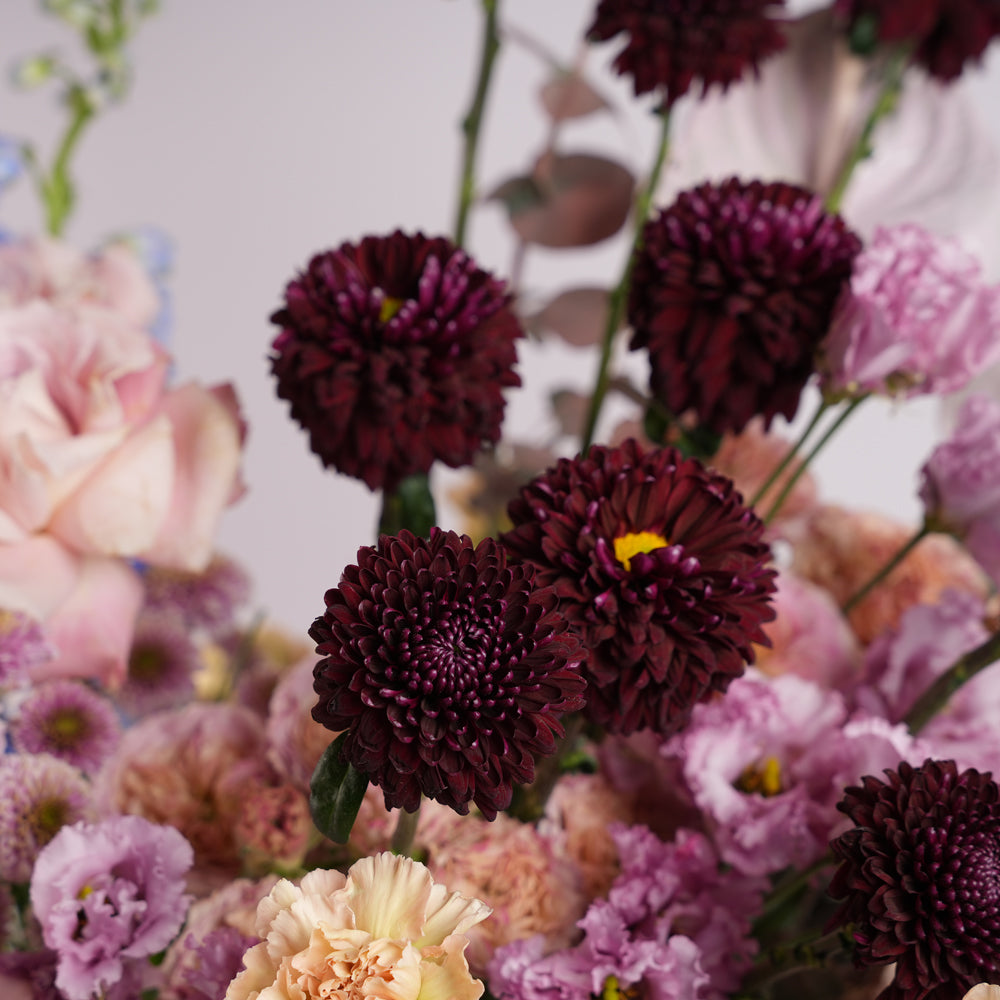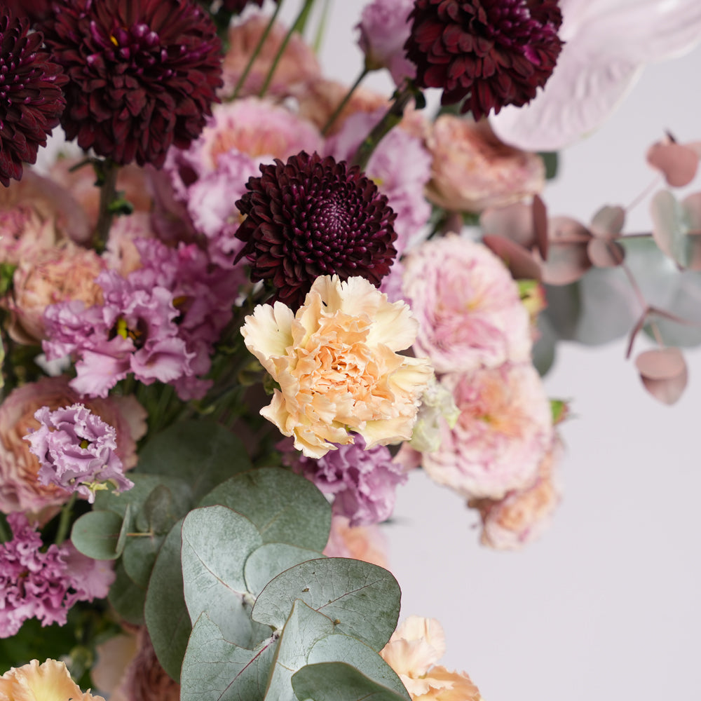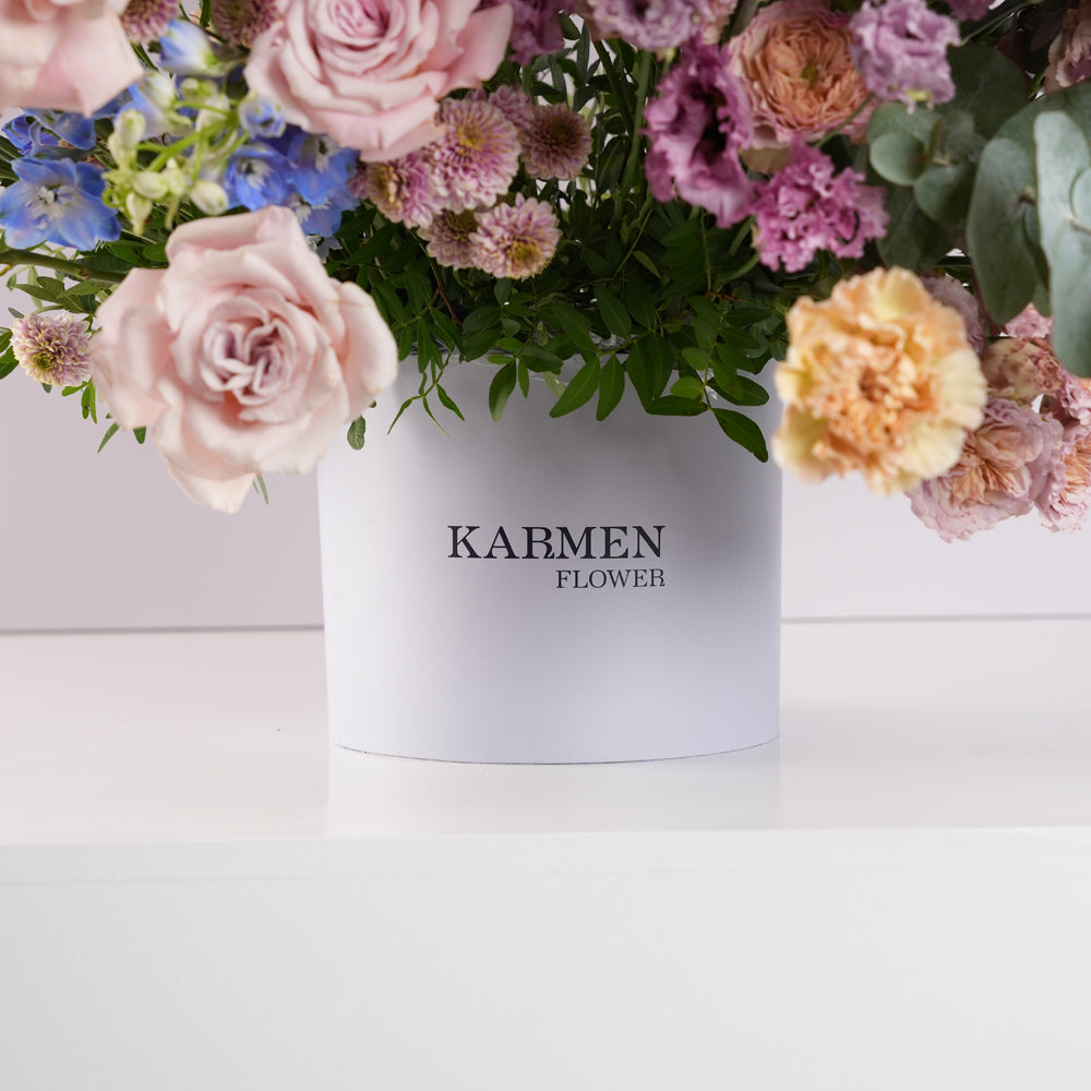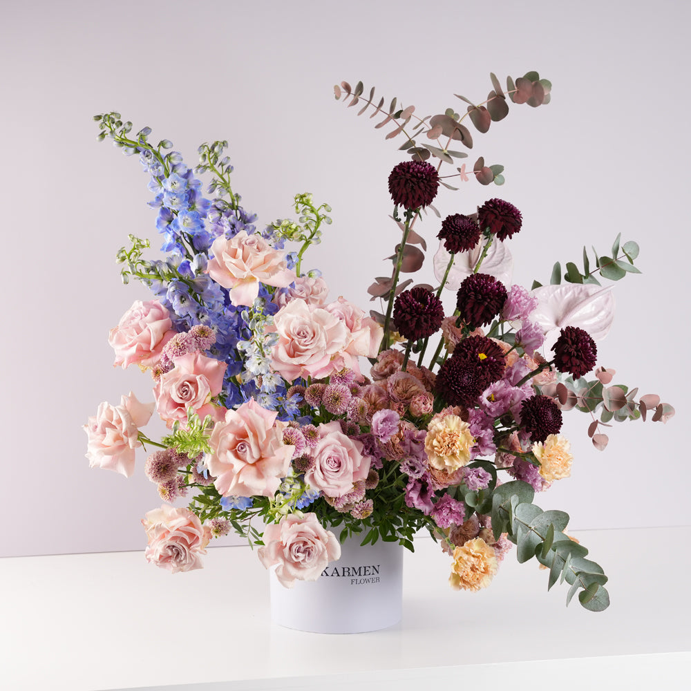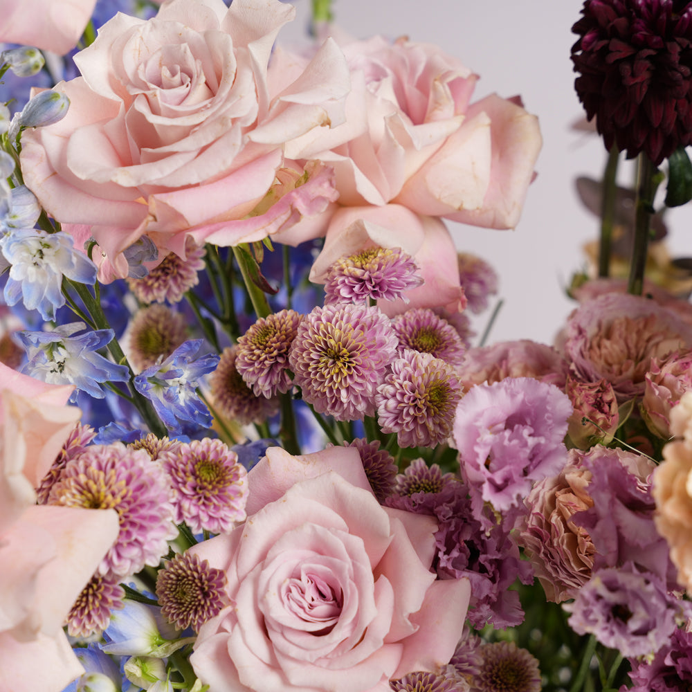 A refined arrangement that speaks in soft tones of elegance and calm. Delicate roses and pastel blooms are layered with airy textures and subtle greenery, creating a balanced composition that feels both graceful and contemporary. Designed to leave a gentle yet lasting impression.